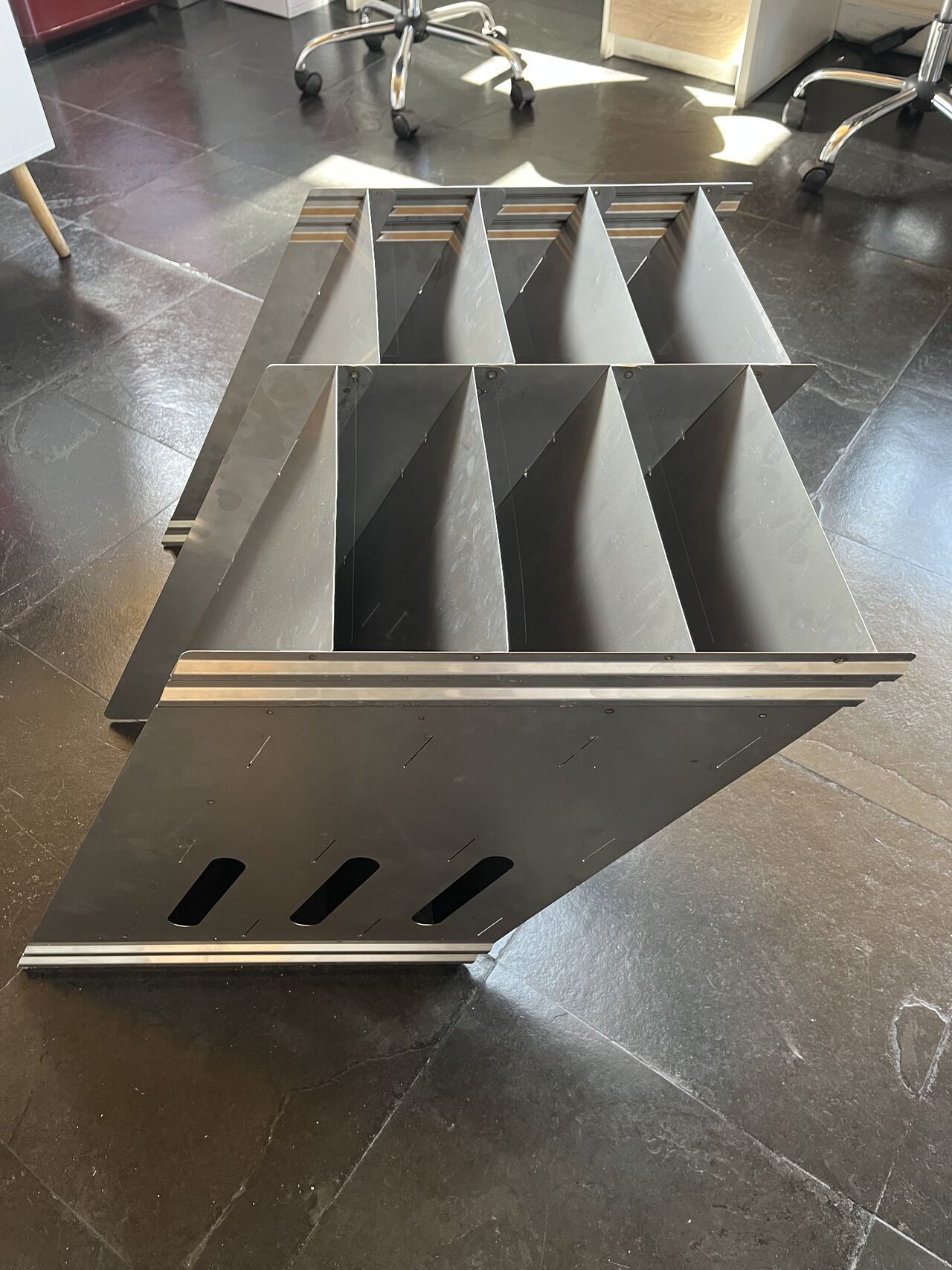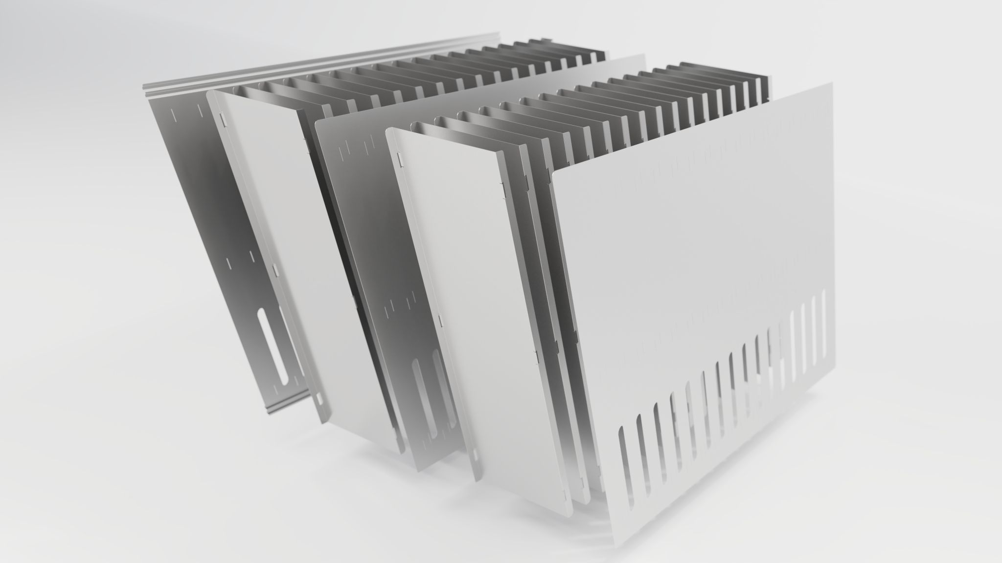 Solo 3 tipos de piezas para configurar un modulo, piezas estandarizadas que se apilan fácilmente para trasporte reduciendo este costo al mínimo: Perfiles Z, placas laterales y placas centrales (luego les contaremos mas detalles de este diseño).